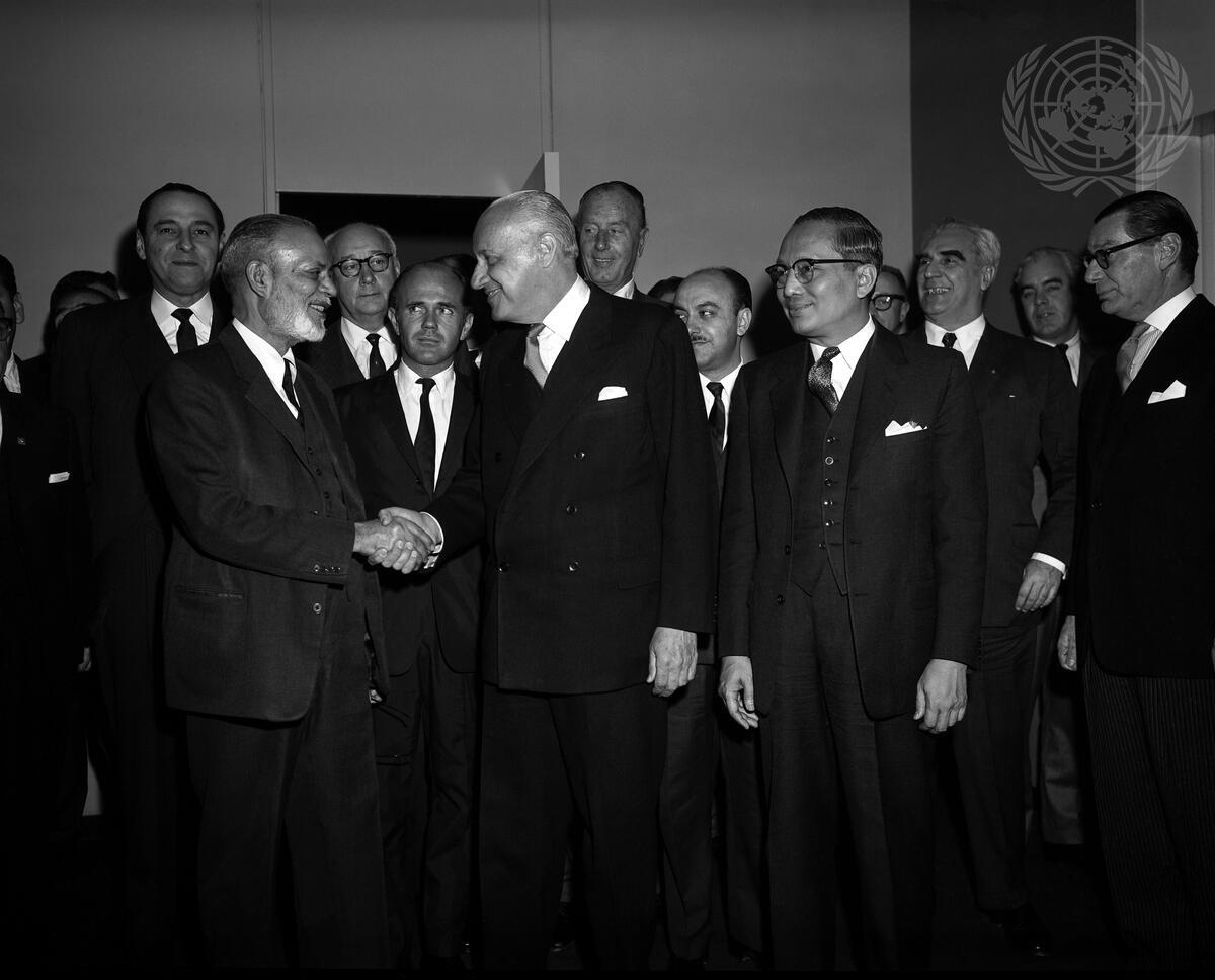 President Alessandri (center) is seen shaking hands with Mr. Muhammad Zafrulla Khan (Pakistan), President of the General Assembly. To the left of the Chilean President is U Thant, Secretary-General of the UN.
