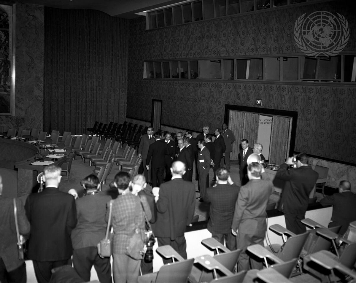 President Goulart (2nd from left, first row, group in background) during the tour as he visited the Security Council chamber. Beside him, at right, is Acting U.N. Secretary-General U Thant.