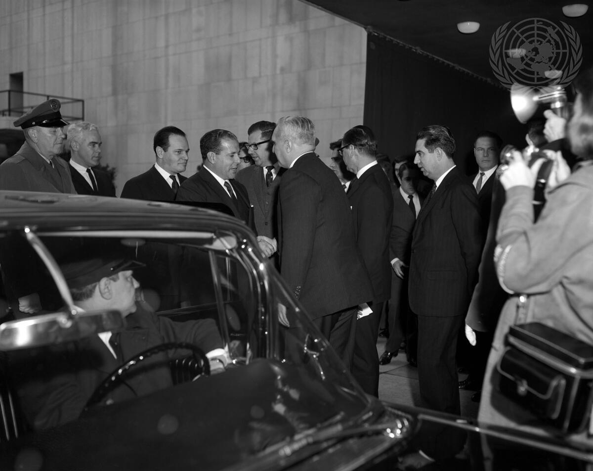 Joao Goulart, President of Brazil (4th from left) at the conclusion of his visit as Dr. Hernane Tavares De Sa, UN Under-Secretary for the Office of Public Information, bade him farewell. Immediately behind the President is Mr. Geraldo de Carvalho Silos, Brazil's Deputy Permanent Representative to the United Nations.