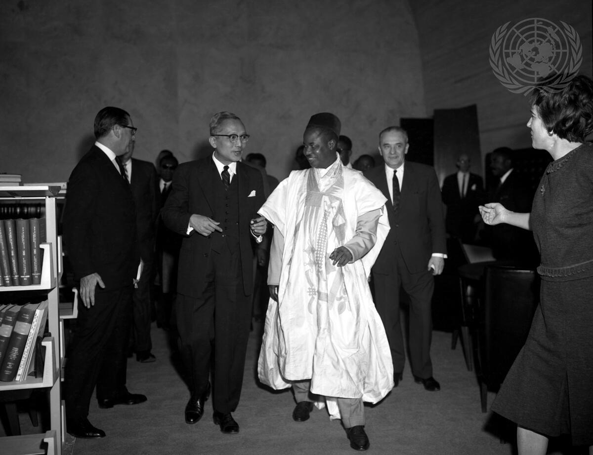 President Ahidojo (right foreground) is seen chatting with Acting Secretary-General U Thant (centre) during his tour of the Library. At left is Mr. Pierre de Meulemeester, U.N. Chief of Protocol.