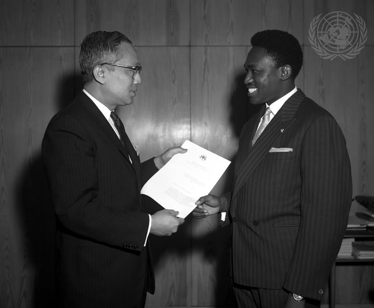 John Boureima Kabore (right), the new Permanent Representative of Upper Volta to the United Nations, is seen presenting his credentials to Secretary-General U Thant this morning.