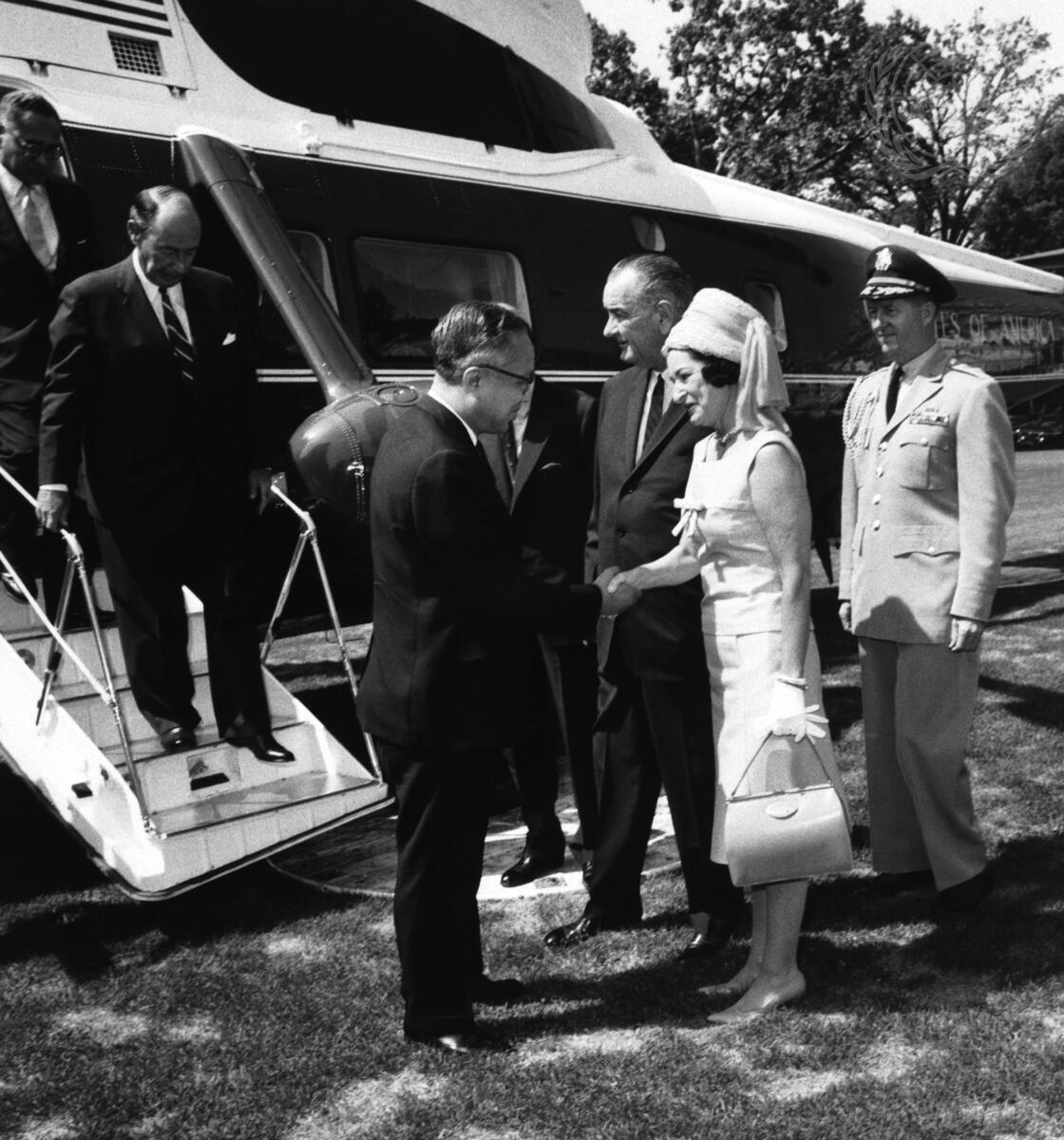 Secretary-General U Thant is seen being greeted by President and Mrs. Johnson upon disembarking from a helicopter at the White House. Behind the Secretary-General are Ambassador Adlai E. Stevenson, Permanent Representative of the United States to the United Nations, and Mr. Ralph J. Bunche, UN Under-Secretary for Special Political Affairs.