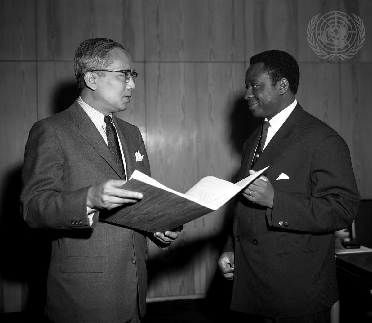 Secretary-General U Thant (left) with Ambassador Benoit Bindzi who is presenting his credentials. Mr. Bindzi has been Cameroon's Permanent Representative ad interim since October 1961.