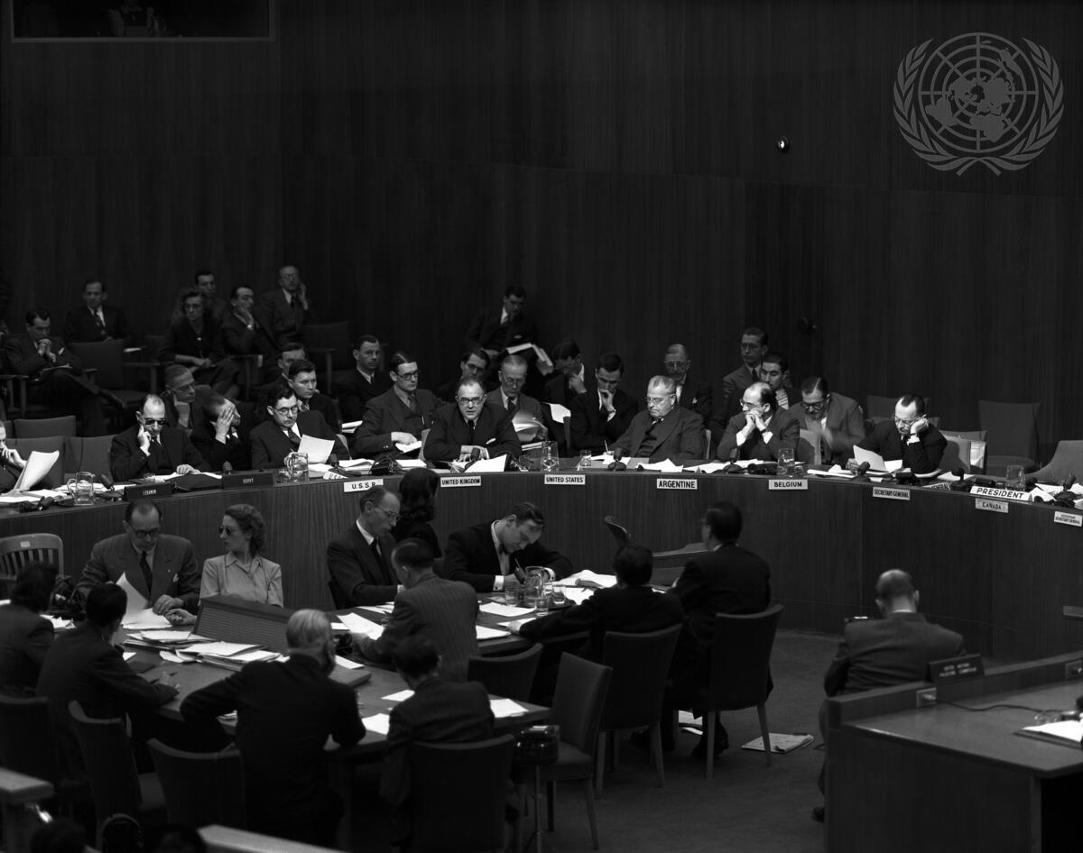 British Secretary of State for the Colonies, Arthur Creech-Jones, addresses United Nations Security Council debate on the Palestine Question. Mr. Creech-Jones declared that while his Government strove to meet the wishes of the Palestine Commission, British public opinion would not permit further entanglement in a policy which one or the other of the parties in Palestine is determined to resist. At table (left to right): Andrei A. Gromyko, USSR; Mr. Creech-Jones; Senator Warren R. Austin, United States; and Joseph Nisot, Belgium.