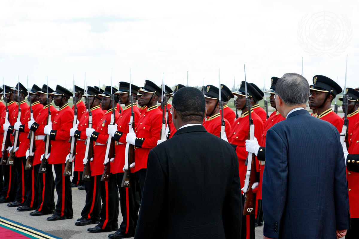 Upon arrival, Secretary-General Ban Ki-moon (right, back to camera), accompanied by Bernard Kamillius Membe (left, back to camera), Minister for Foreign Affairs of the United Republic of Tanzania, inspects the guard of honour.