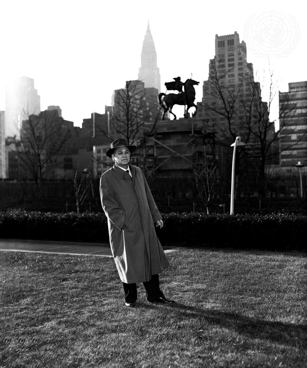 Mr. Antun Augustincic, sculptor of the giant equestrian figure in the background, as he visited the gardens north of the General Assembly Building at U.N. Headquarters, to observe the progress of work in connection with installation of the statue atop an eighteen-foot marble pedestal.