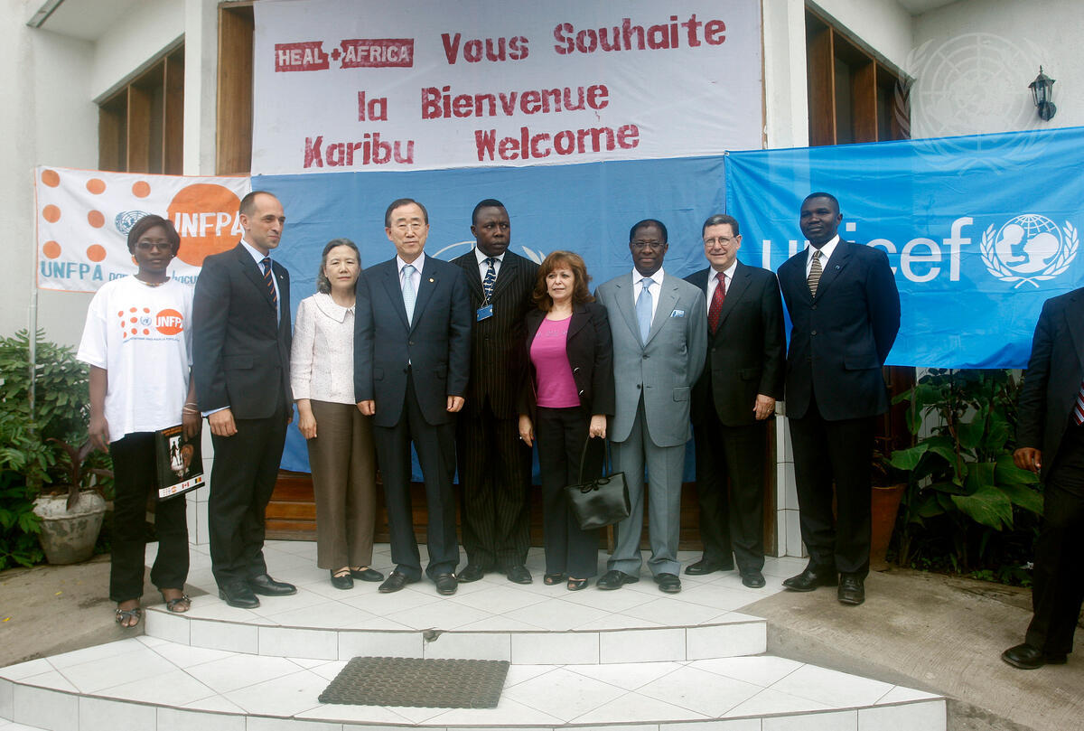 Secretary-General Ban Ki-moon (fourth from left) and his wife, Yoo Soon-taek (third from left), pose for a group photo with Jean Robert Likofata (centre), Community Health Coordinator for HEAL Africa; Alan Doss (second from right), Head of the United Nations Organization Mission in the Democratic Republic of the Congo (MONUC); Mrs. Doss (fourth from right); and Alexis Thambwe Mwamba (third from right), Foreign Minister of the Democratic Republic of the Congo; at the HEAL Africa hospital in Goma, Democratic Republic of the Congo.