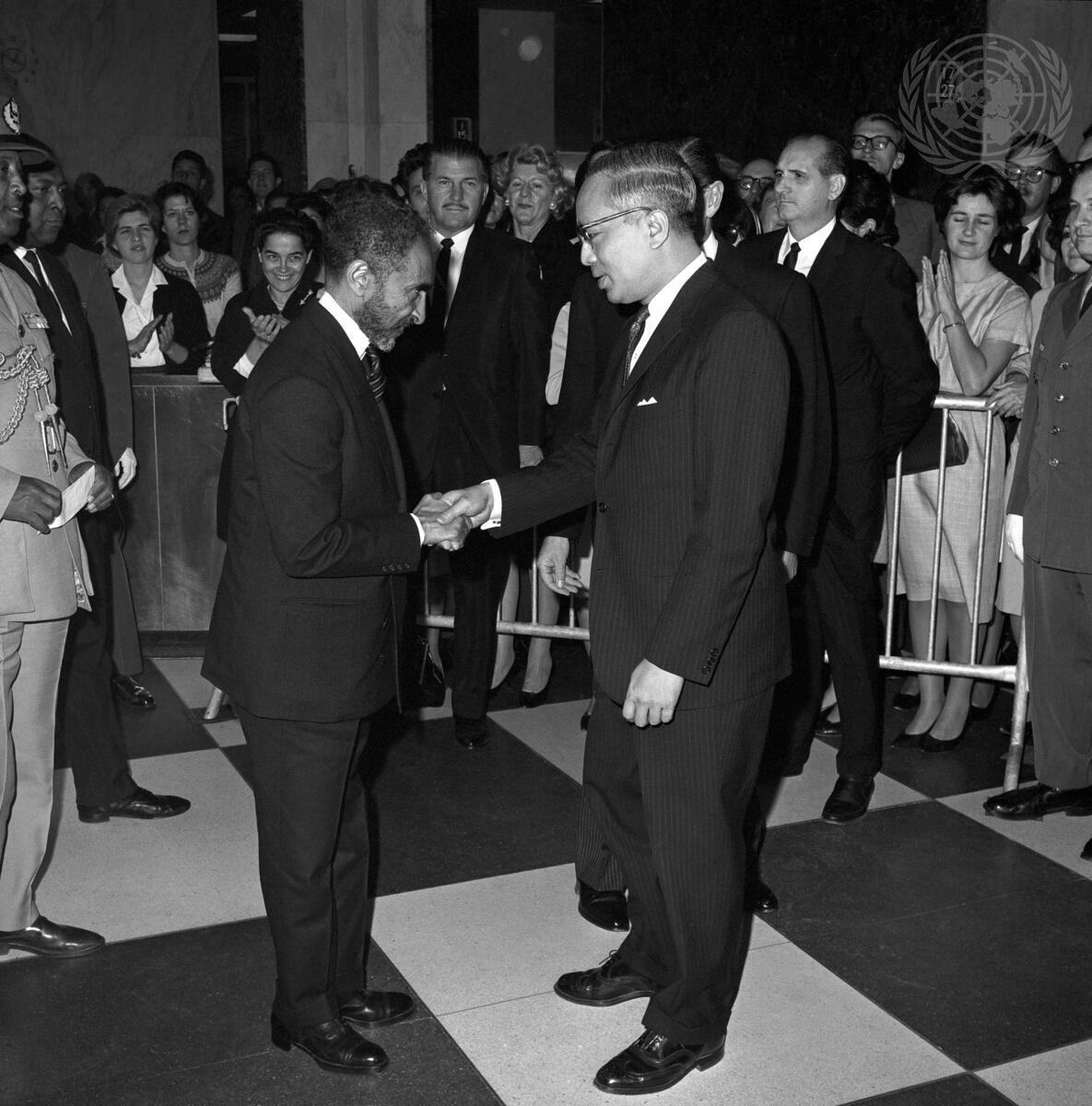 His Imperial Majesty Haile Selassie I, Emperor of Ethiopia (centre, left) is welcomed to the United Nations Headquarters by Secretary-General U Thant (centre, right).