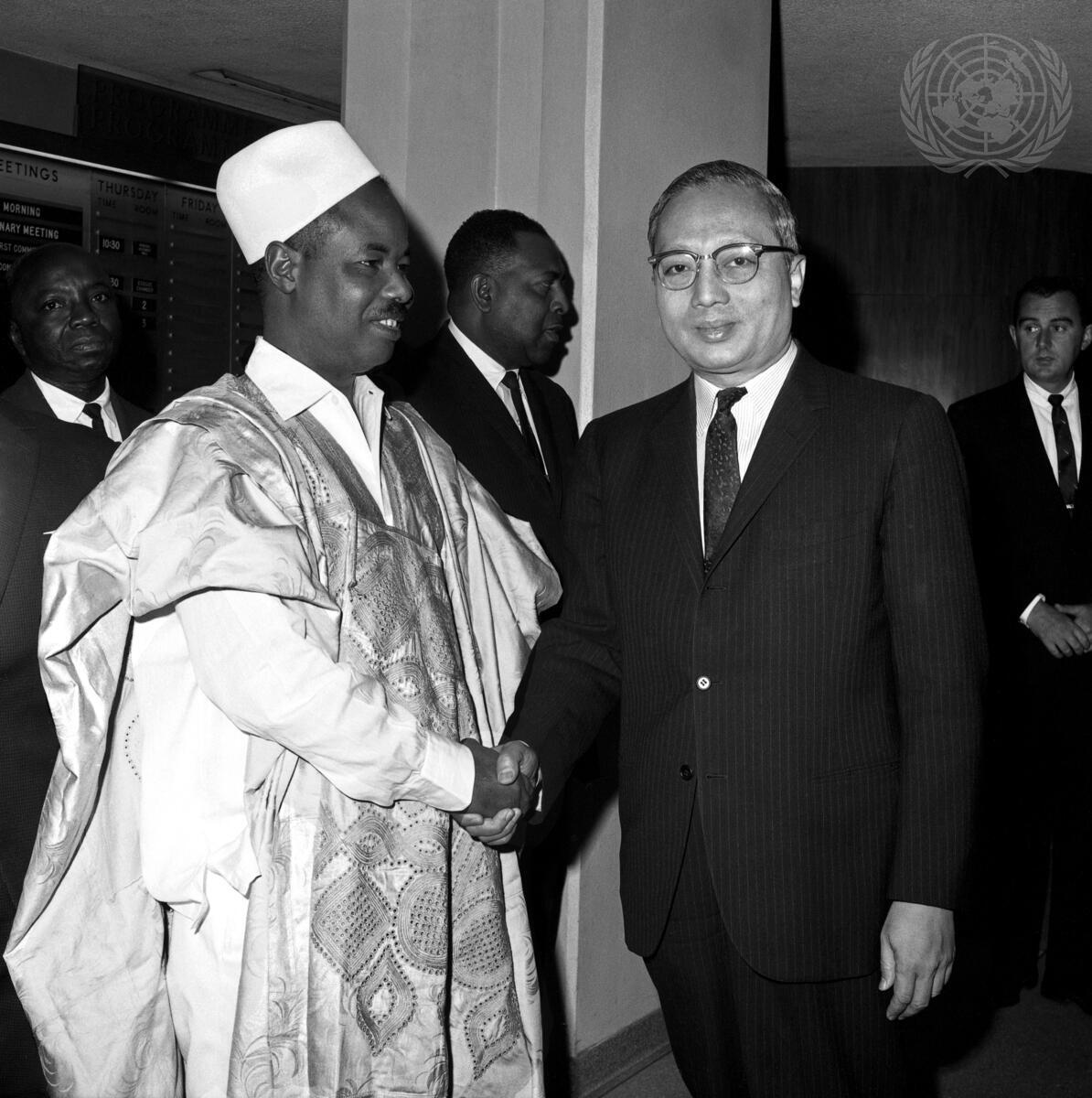 His Excellency Ahmadou Ahidjo (l), President of the Republic of Cameroon, is seen here as he was welcomed upon his arrival at U.N. Headquarters this morning by Secretary-General U Thant.