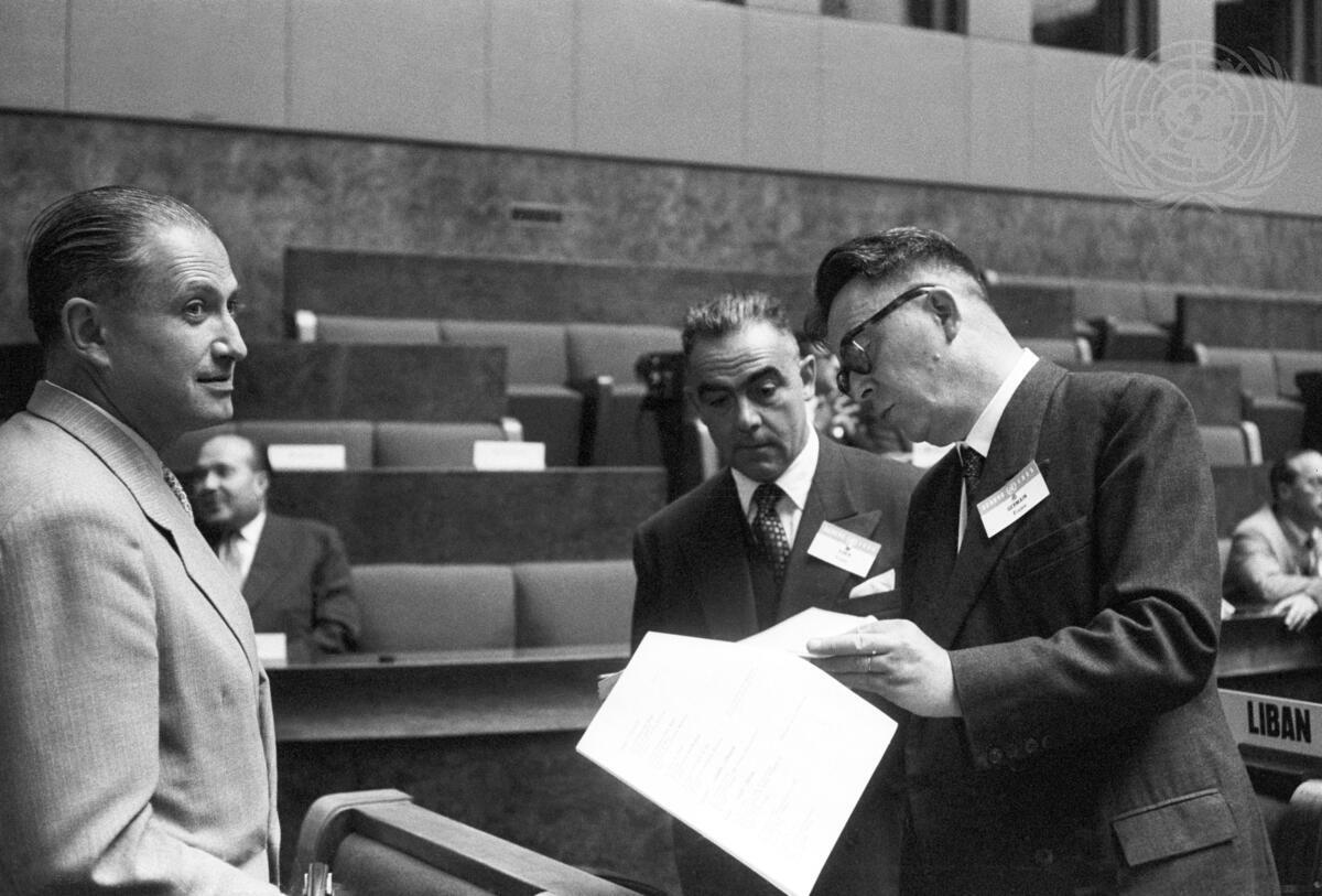 Two delegates from France, looking at a document before a meeting: – Messrs. Aubin (center) and Germain.