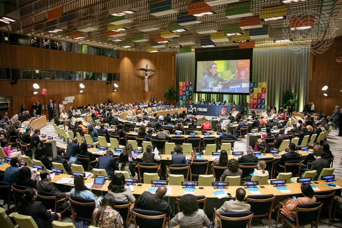 A wide view of the room as Henrietta H. Fore (on screen), Executive Director of the United Nations Children's Fund (UNICEF), speaks at the high-level commemorative event of the General Assembly on thirtieth anniversary of the adoption of the Convention on the Rights of the Child.