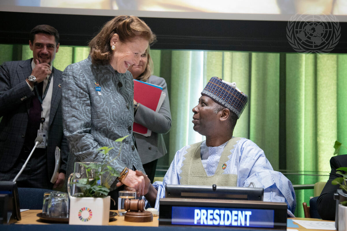 Henrietta H. Fore, Executive Director of the United Nations Children's Fund (UNICEF) greets Tijjani Muhammad-Bande, President of the seventy-fourth session of the United Nations General Assembly, at the high-level commemorative event of the General Assembly on thirtieth anniversary of the adoption of the Convention on the Rights of the Child.