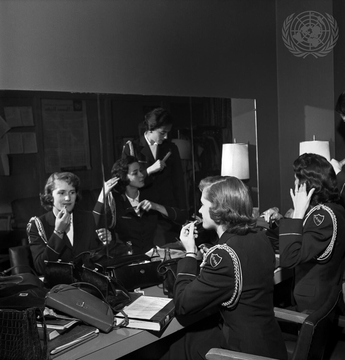 Here, three Guides apply the final touches prior to starting their daily rounds. They are (left to right): Monica Nachmanson, of Sweden; Mary Ann Gardner, of the U.S., and Claudia Andujar (brushing uniform), also of the U.S.