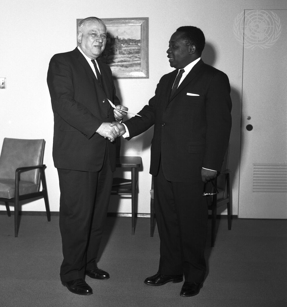 Ambassador Gershon B.O. Collier (right), the first Permanent Representative of Sierra Leone to the United Nations, photographed at U.N. Headquarters as he shook hands with U.N. Under-Secretary Andrew W. Cordier, to whom he presented his credentials. Sierra Leone was recently admitted to membership in the United Nations and became the 100th Member Sate of the Organization.