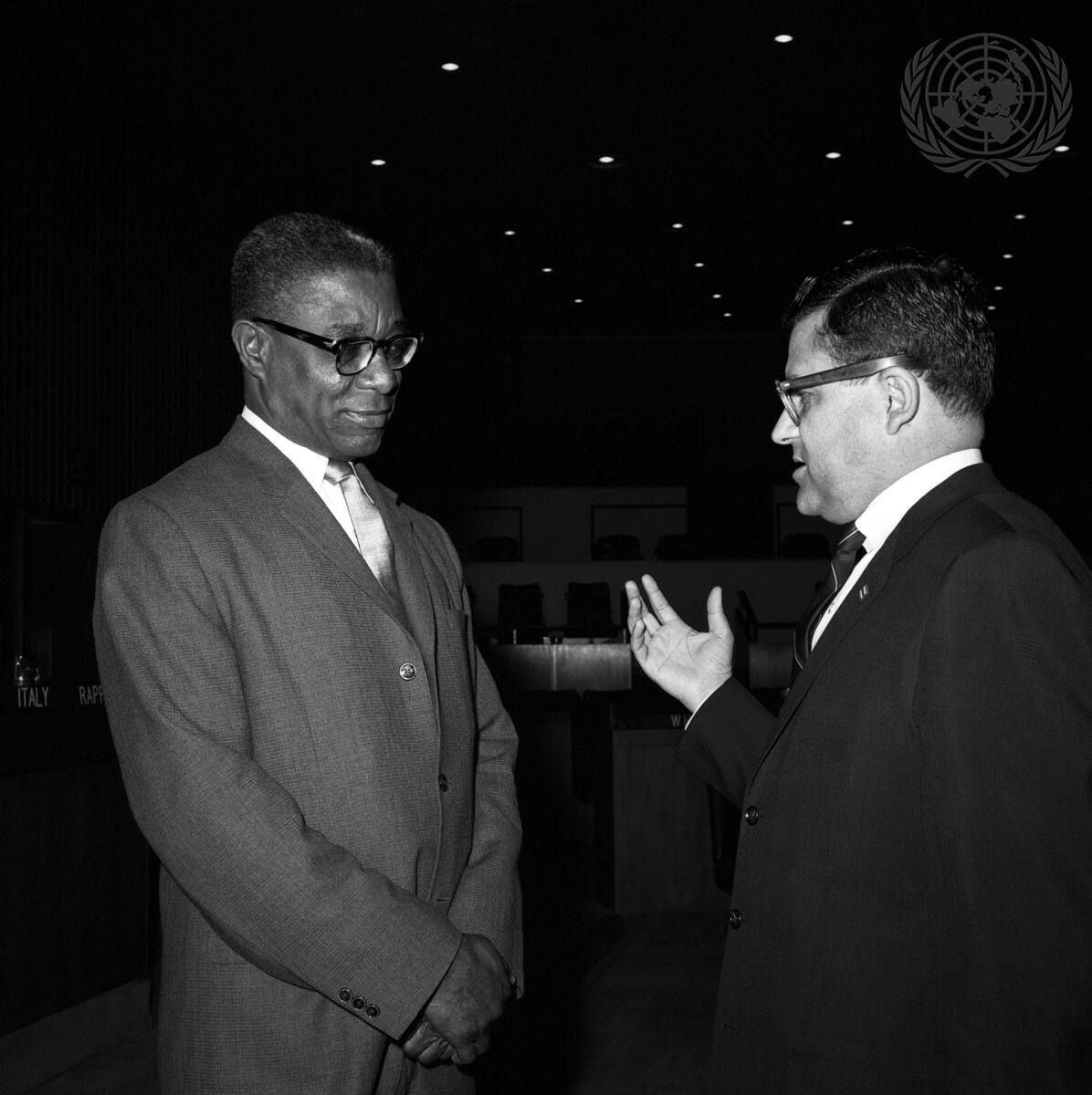 Seen conferring before the opening of the meeting (Left to right), Mr. E.R. Richardson (Jamaica), Chairman of the Committee, and Mr. Fernando Volio Jimenez (Costa Rica).