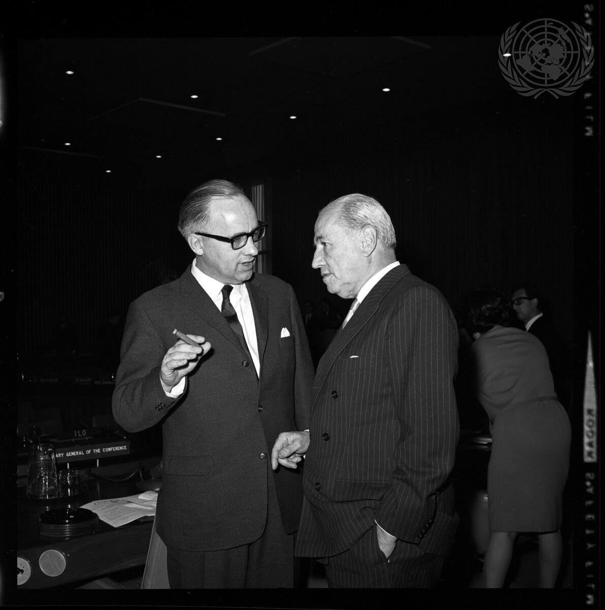 Mr. A. Rosenstand Hansen (left) of Denmark, Chairman of the Committee, conversing with Mr. Raúl Prebisch, Secretary-General of the Conference on Trade and Development.