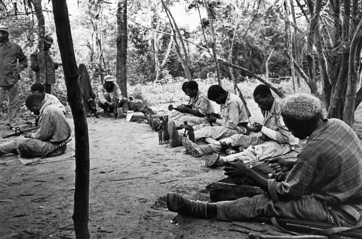 Makonde wood-carvers at work in a Frelimo production camp. The Makonde are famous for their ebony carvings. Other crafts such as weaving and pottery are also practised in the production camps. Some of the finished products are exported to Tanzania in exchange for needed domestic and military supplies. [Exact date unknown]