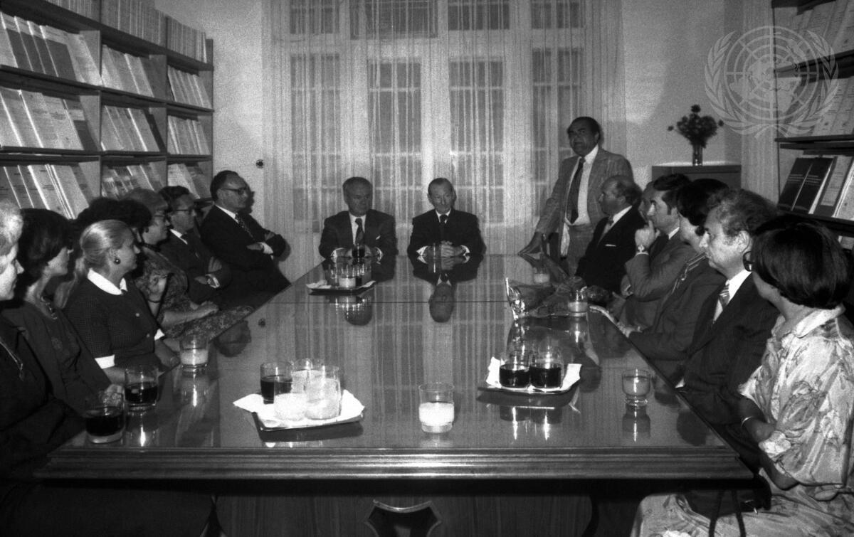 Secretary-General Kurt Waldheim (at the head of the table, right) and Mrs. Waldheim (third from right) visiting the UN Information Centre (UNIC). Standing is A.S. Dajani, Director, UNIC-Bucharest. To Mr. Waldheim’s right is Vasile Gliga, Deputy Minister of External Affairs of Romania.