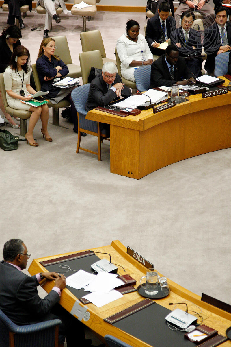 Hervé Ladsous (top, front row left), Under-Secretary-General for Peacekeeping Operations, presents to the Security Council the Secretary-General's report on the situation in Abyei, Sudan. The Council also heard a statement from Daffa-Alla Elhag Ali Osman (foreground), Permanent Representative of the Republic of the Sudan to the UN.
