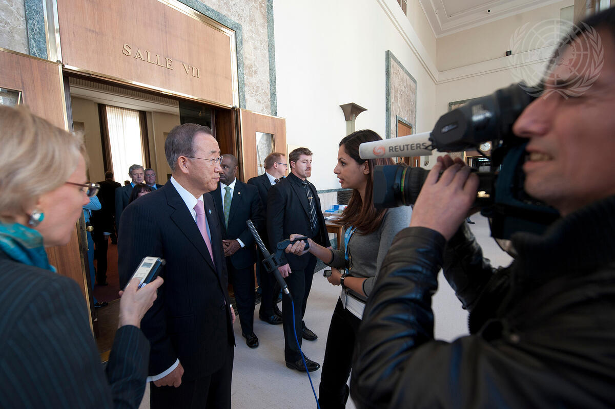 Secretary-General Ban Ki-moon (centre) gives a statement on the Israeli-Palestinian prisoner exchange taking place today, which will include the release of abducted Israeli soldier Gilad Shalit, to a Reuters news crew in Geneva, Switzerland.