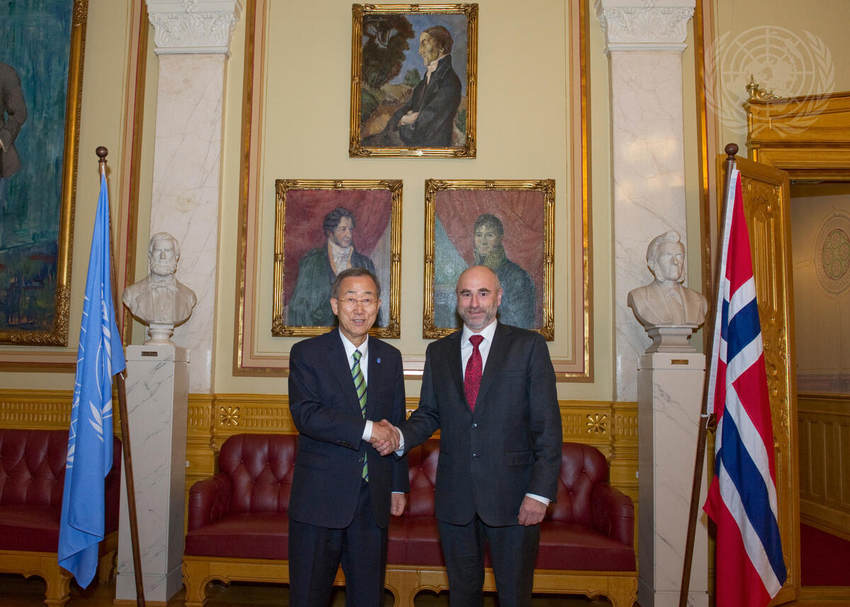 Secretary-General Ban Ki-moon (left) meets with Dag Terje Andersen, President of the Storting, Norway’s Parliament, at the Parliament Building in Oslo.