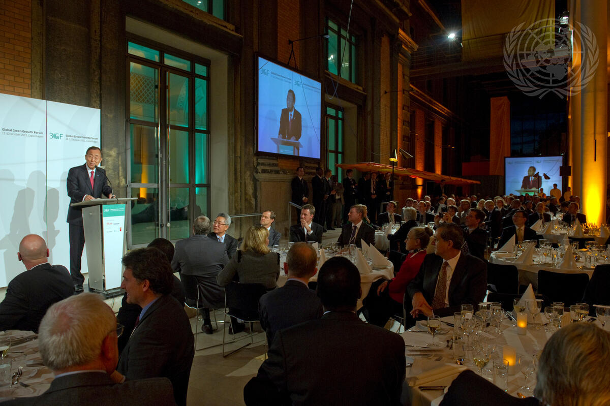 Secretary-General Ban Ki-moon (at podium, on screens) speaks at a dinner hosted by Danish Prime Minister Helle Thorning-Schmidt in honour of the participants of the Global Green Growth Forum (3GF), in Copenhagen, Denmark.
