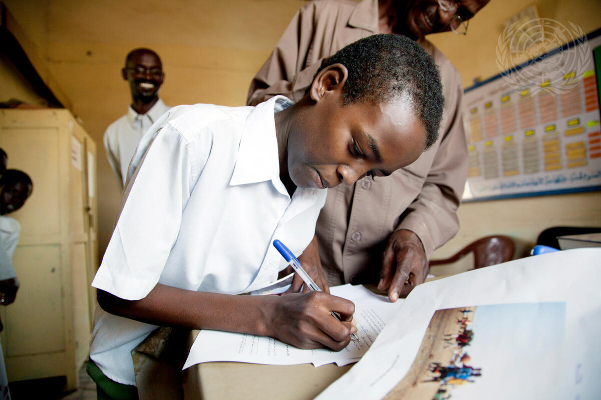 Fourteen-year-old Ma’as Maki Adduma of Ibn Sina Primary School for Boys in El Fasher, Sudan, is one of the 30 winners of the “Eyes of Darfur” project, co-sponsored by the African Union-United Nations Hybrid Operation in Darfur (UNAMID) and the UN Children’s Fund (UNICEF). Ma’as signs a copyright authorization form for use of his winning photograph.
