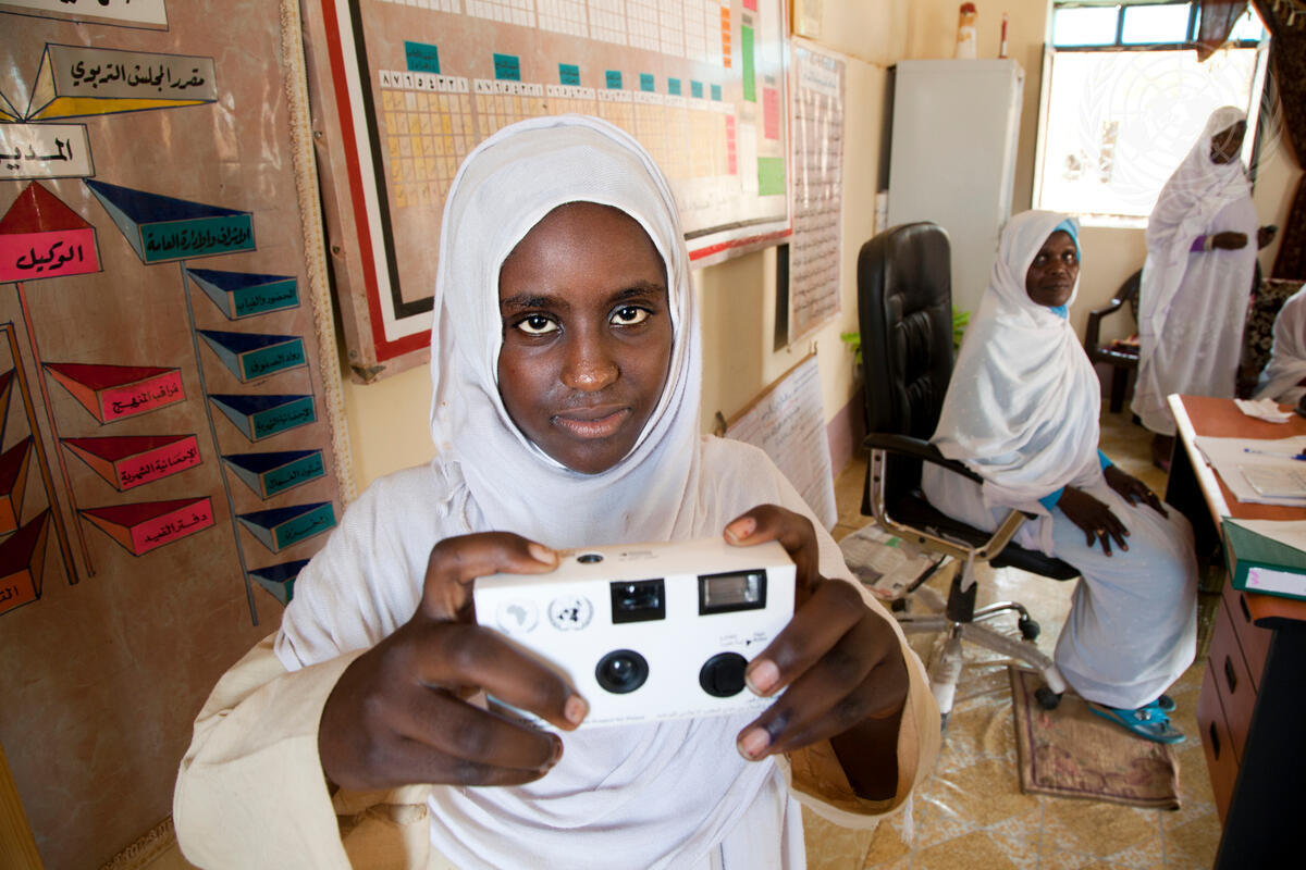 Eleven-year-old Hiba Al Amin Umar and her camera in El Fasher, North Darfur. Hiba is one of the 30 winners of the “Eyes of Darfur” project, co-sponsored by the African Union-United Nations Hybrid Operation in Darfur (UNAMID) and the UN Children’s Fund (UNICEF), in which 700 children received cameras and took a total of 15,000 photos.
