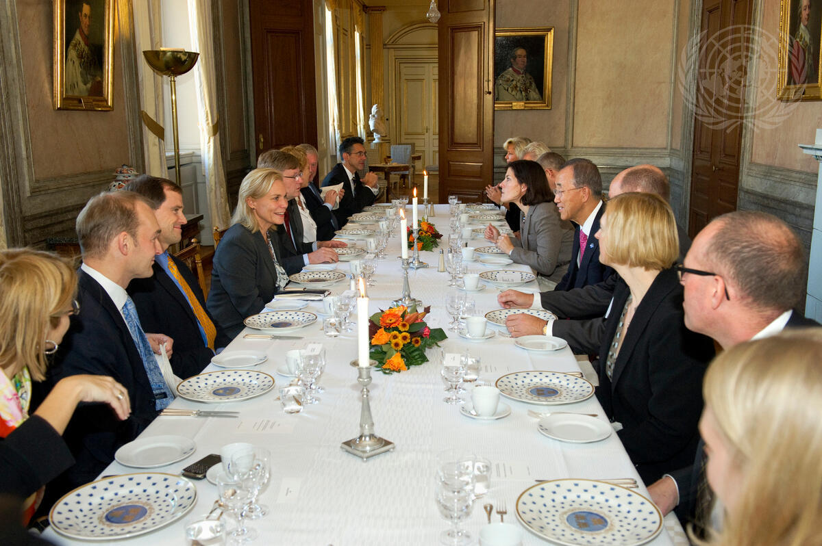 Secretary-General Ban Ki-moon (fifth from right) attends a working luncheon hosted by Sweden’s Minister for International Development Cooperation, Gunilla Carlsson (fourth from left), in Stockholm.