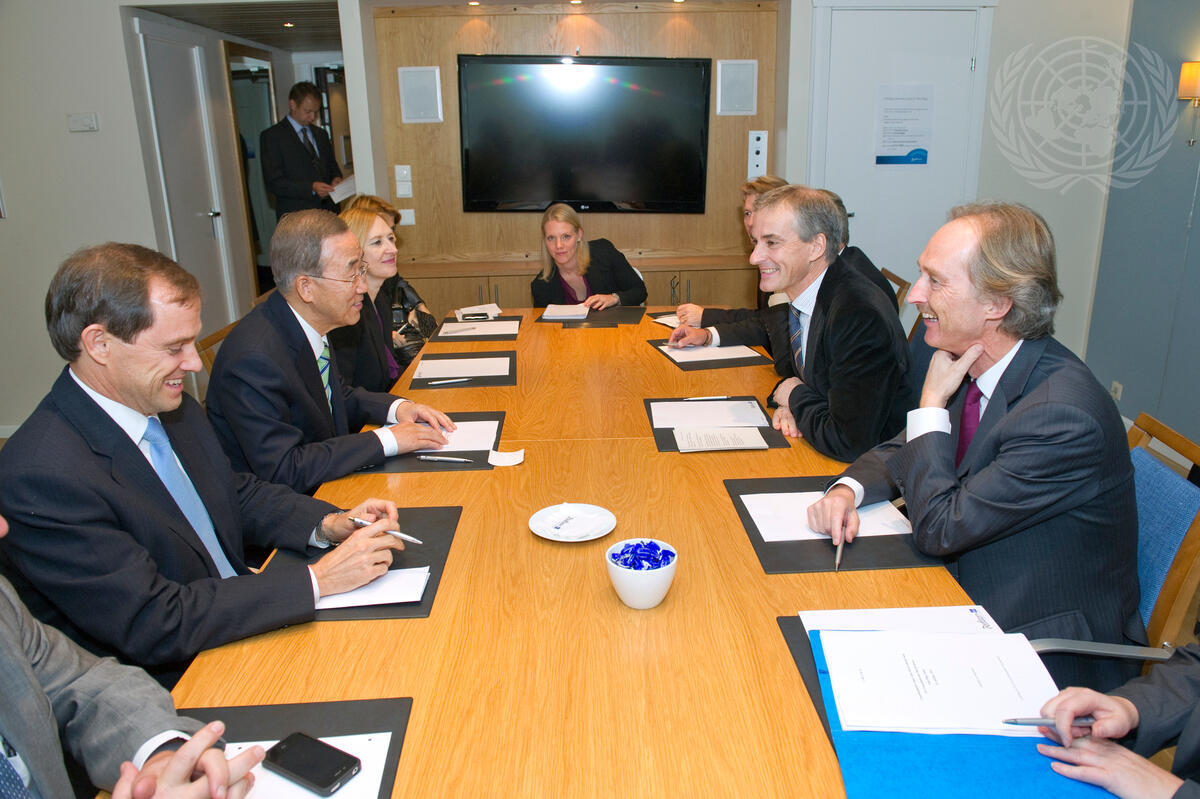 Secretary-General Ban Ki-moon (second from left) meets with Jonas Gahr Støre (second from right), Minister for Foreign Affairs of Norway, in Oslo. With Mr. Ban is Robert Orr (left), Assistant Secretary-General for Policy Coordination and Strategic Planning.