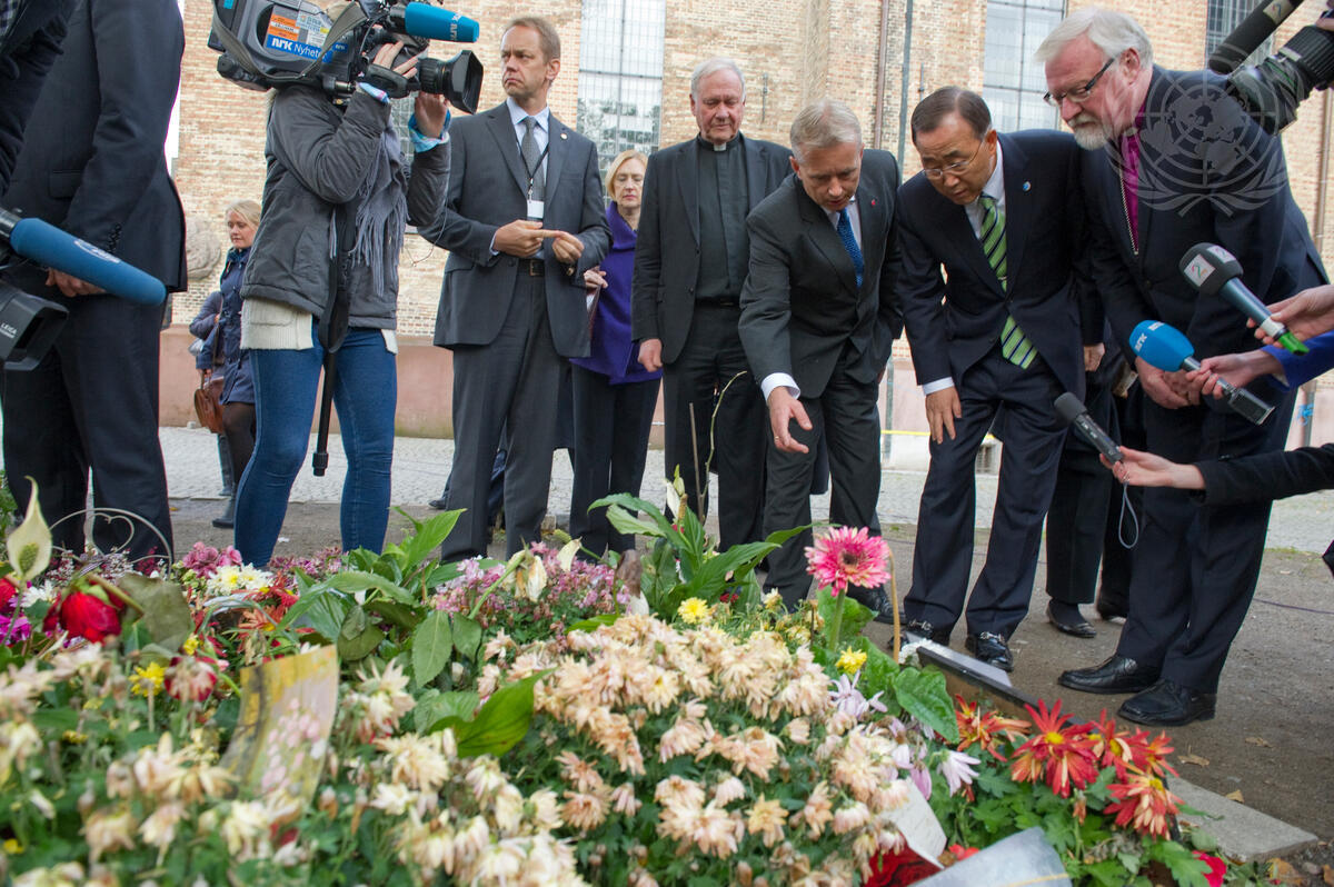 Secretary-General Ban Ki-moon (second from right) lays flowers at a site in Oslo, Norway, in memory of the victims of the bombing and related attacks which took place in Oslo and outside the city, on 22 July 2011.