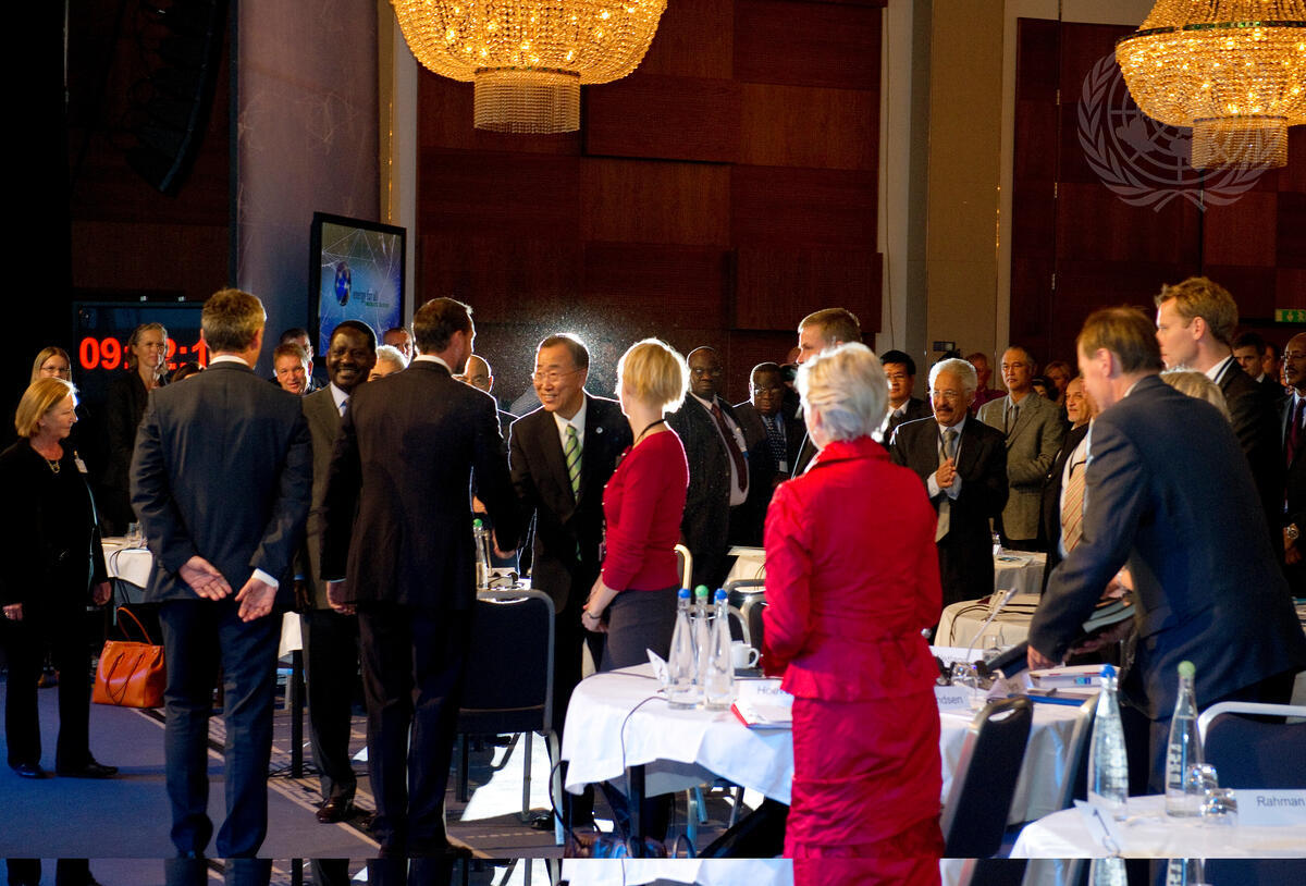 Secretary-General Ban Ki-moon (centre, facing camera) greets Crown Prince Haakon of Norway at the international conference, “Energy for All: Financing Access for the Poor”, in Oslo.