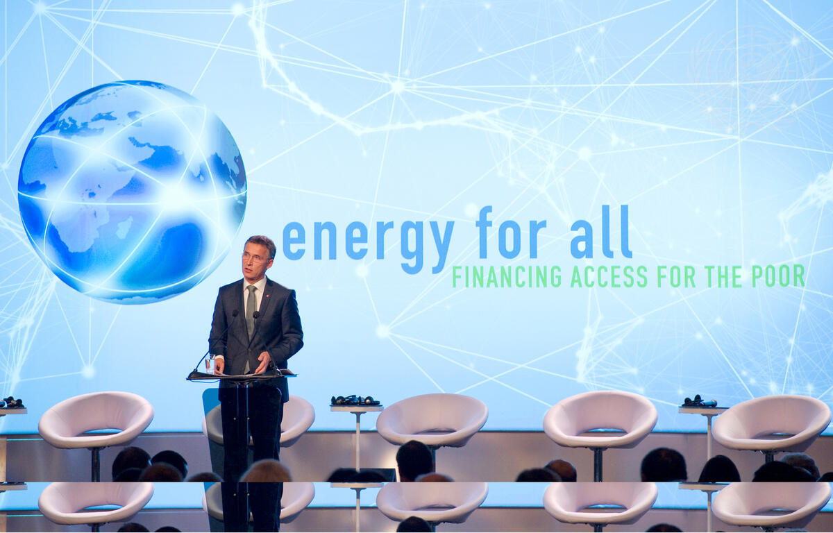 Norwegian Prime Minister Jens Stoltenberg (on stage) hosts the international conference, “Energy for All: Financing Access for the Poor”, attended by Secretary-General Ban Ki-moon, in Oslo, Norway.