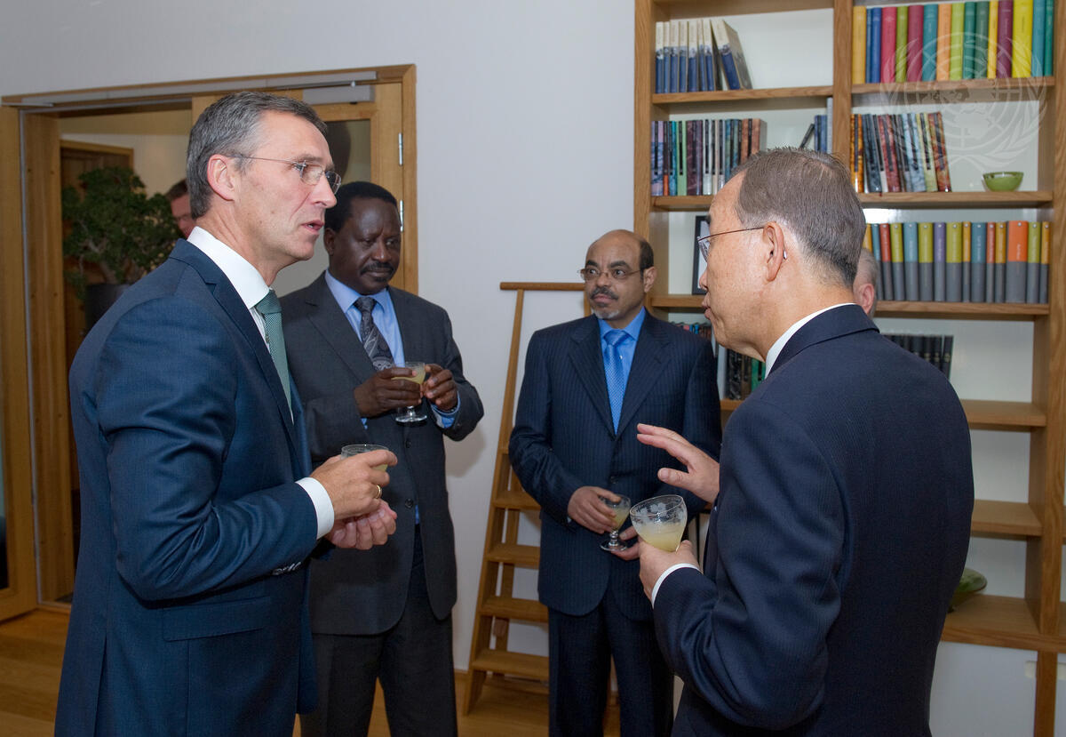 Secretary-General Ban Ki-moon (right) chats with Jens Stoltenberg (left), Prime Minister of Norway, during a luncheon hosted by Mr. Stoltenberg and attended by Raila Odinga (second from left), Prime Minister of Kenya, and Meles Zenawi (second from right), Prime Minister of Ethiopia, in Oslo, Norway.