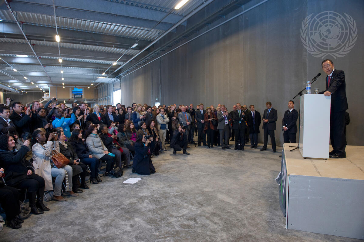 Secretary-General Ban Ki-moon (at podium) addresses UN staff members at the construction site of the new UN City in Copenhagen, Denmark. With two campuses on the Copenhagen waterfront, the new complex will house the offices of approximately 1,000 UN employees.
