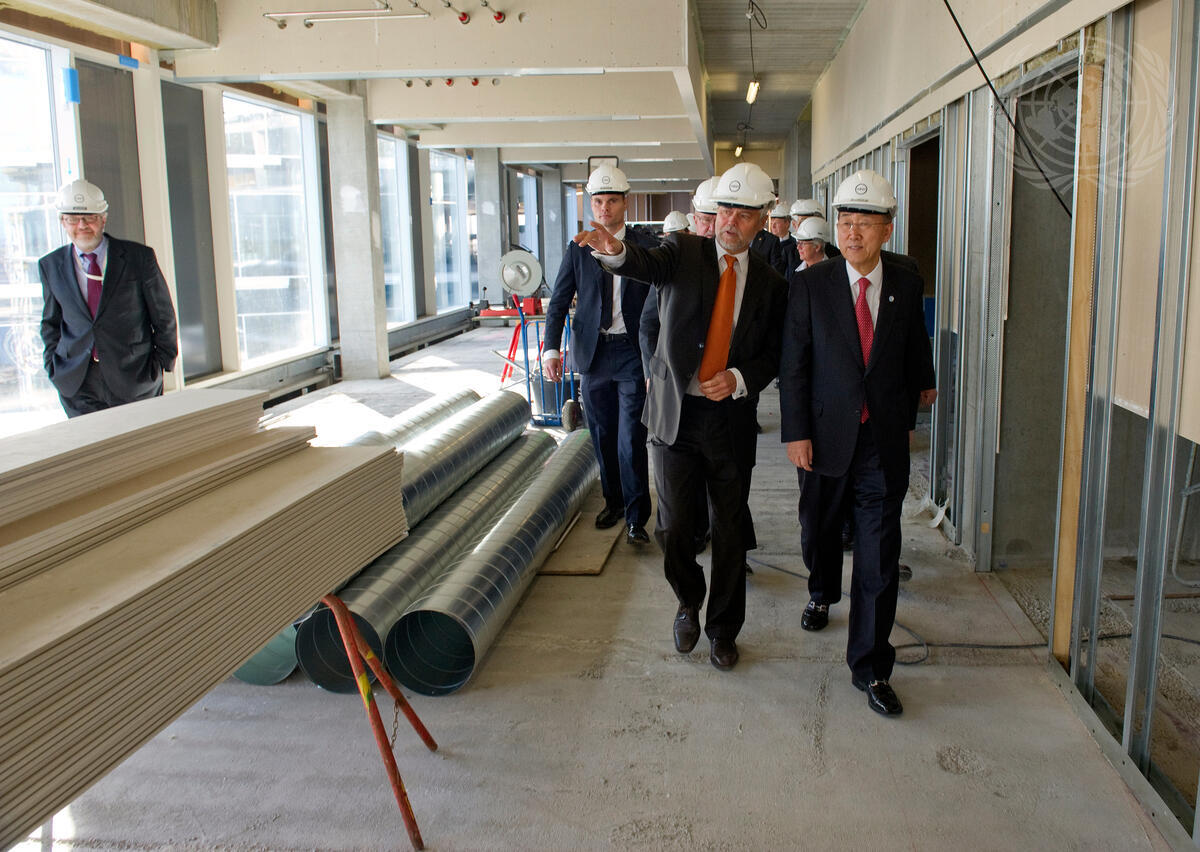 Secretary-General Ban Ki-moon (front, right) is guided through the construction site of the new UN City in Copenhagen, Denmark, by Jens Kramer Mikkelsen (next to Mr. Ban), Managing Director of CPH City and Port Development. The two campuses of the UN complex, set along the Copenhagen waterfront, will house the offices of approximately 1,000 UN employees.