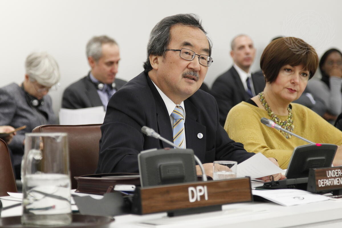 Kiyotaka Akasaka (left), Under-Secretary-General for Public Information and Head of the UN’s Department of Public Information (DPI), briefs the Fourth Committee of the General Assembly on the work of the Department, including its coverage of recent events. At right is Simona-Mirela Miculescu, Permanent Representative of Romania to the UN and Chair of the Committee.