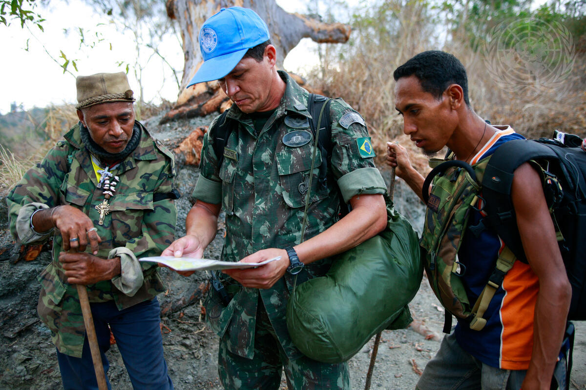 A team from the UN Integrated Mission in Timor-Leste (UNMIT) is shown on a four-hour walk from Turiscai to the village of Lesuata, Timor-Leste, where they will conduct interviews with locals and speaks with the suco (village) chief. This type of visit is conducted two to three times a year by UNMIT staff, usually to villages that are very remote and inaccessible by car.