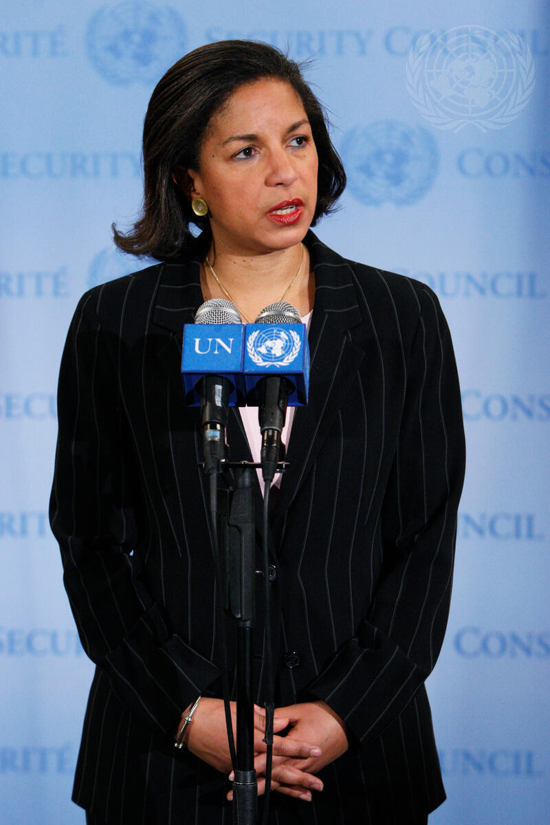 Susan E. Rice, Permanent Representative of the United States of America to the United Nations, speaks to journalists following Security Council consultations on the Korean Peninsula.