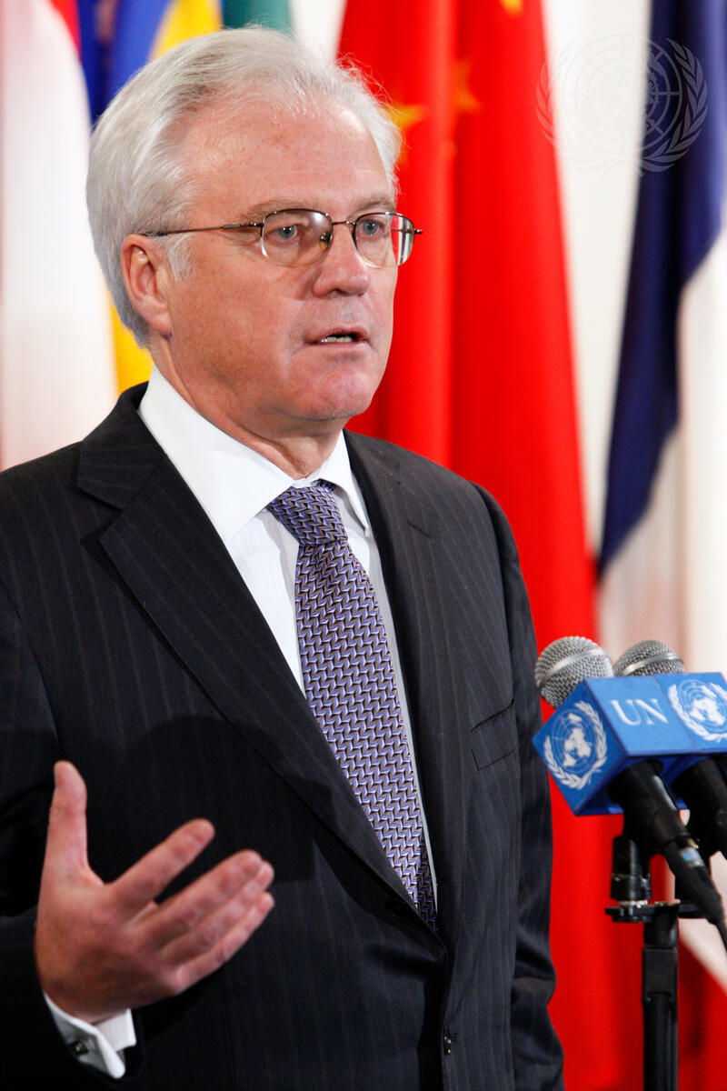Vitaly Churkin, Permanent Representative of the Russian Federation to the United Nations, speaks to journalists following Security Council consultations on the Korean Peninsula.