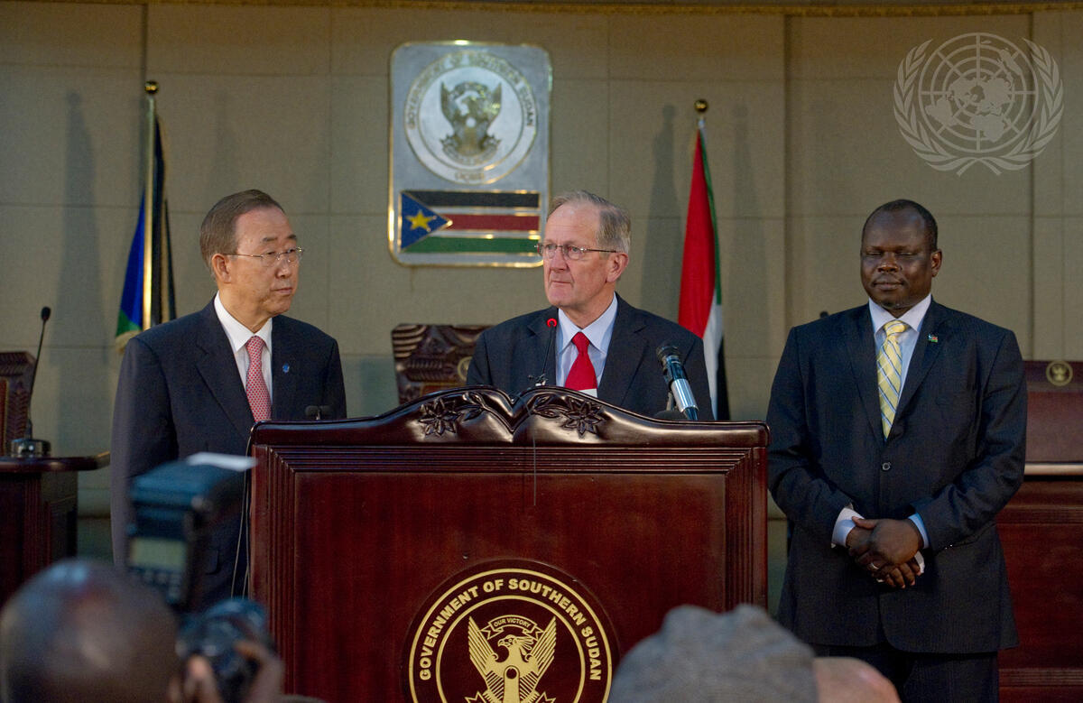 Secretary-General Ban Ki-moon (left) and Joseph Deiss (centre), President of the sixty-fifth session of the General Assembly, brief the press following their meeting with Salva Kiir Mayardit, President of the Government of Southern Sudan, in South Sudanese capital, Juba. At right is Pagan Amum Okeich, Secretary General of the Sudan People’s Liberation Movement (SPLM) and Minister of Peace and Comprehensive Peace Agreement (CPA) Implementation of the Government of Southern Sudan.
