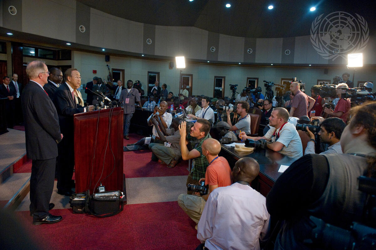 Secretary-General Ban Ki-moon (at podium) and Joseph Deiss (left of Mr. Ban), President of the sixty-fifth session of the General Assembly, brief the press following their meeting with Salva Kiir Mayardit, President of the Government of Southern Sudan, in South Sudanese capital, Juba.