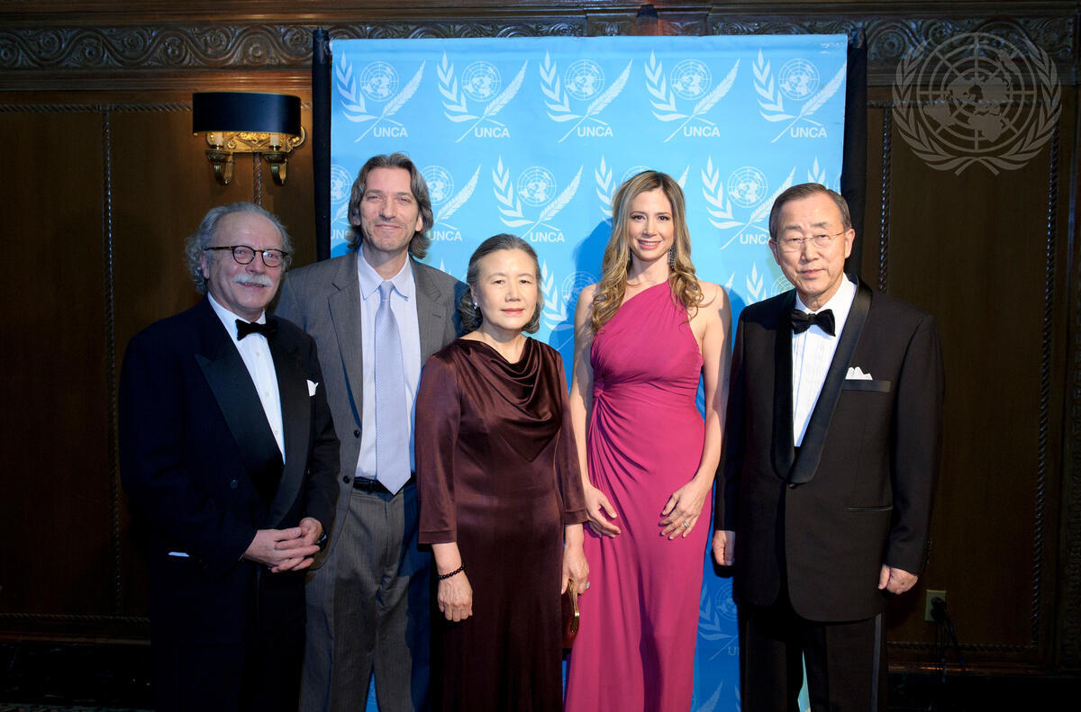 Secretary-General Ban Ki-moon (right) and his wife, Yoo Soon-taek (centre), attend the 15th Annual United Nations Correspondents Association Awards. Seen here with (from left to right) Giampaolo Pioli, President of UNCA; John Prendergast, co-founder of the Enough Project; and Mira Sorvino, Academy Award-winning actress and UNODC Goodwill Ambassador.