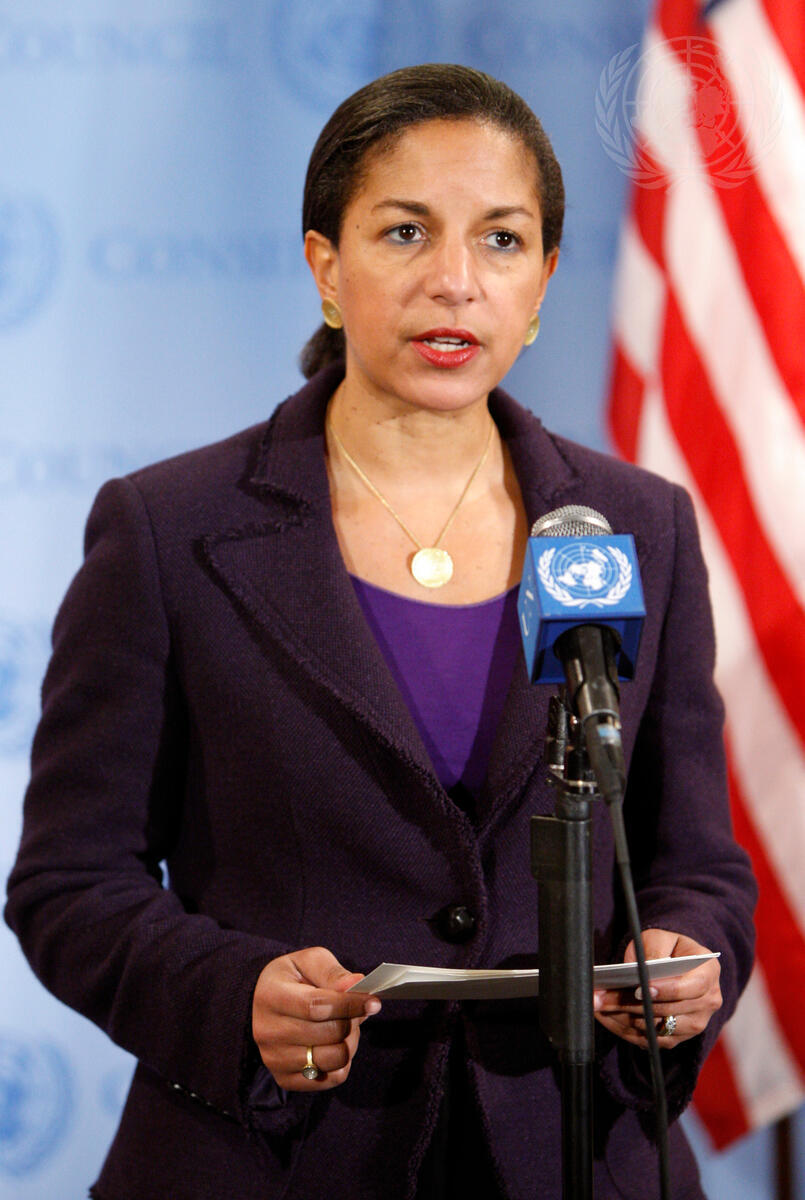 Susan E. Rice, Permanent Representative of the United States and Security Council President for the month of December, speaks to the press following a Security Council meeting on women, peace and security.