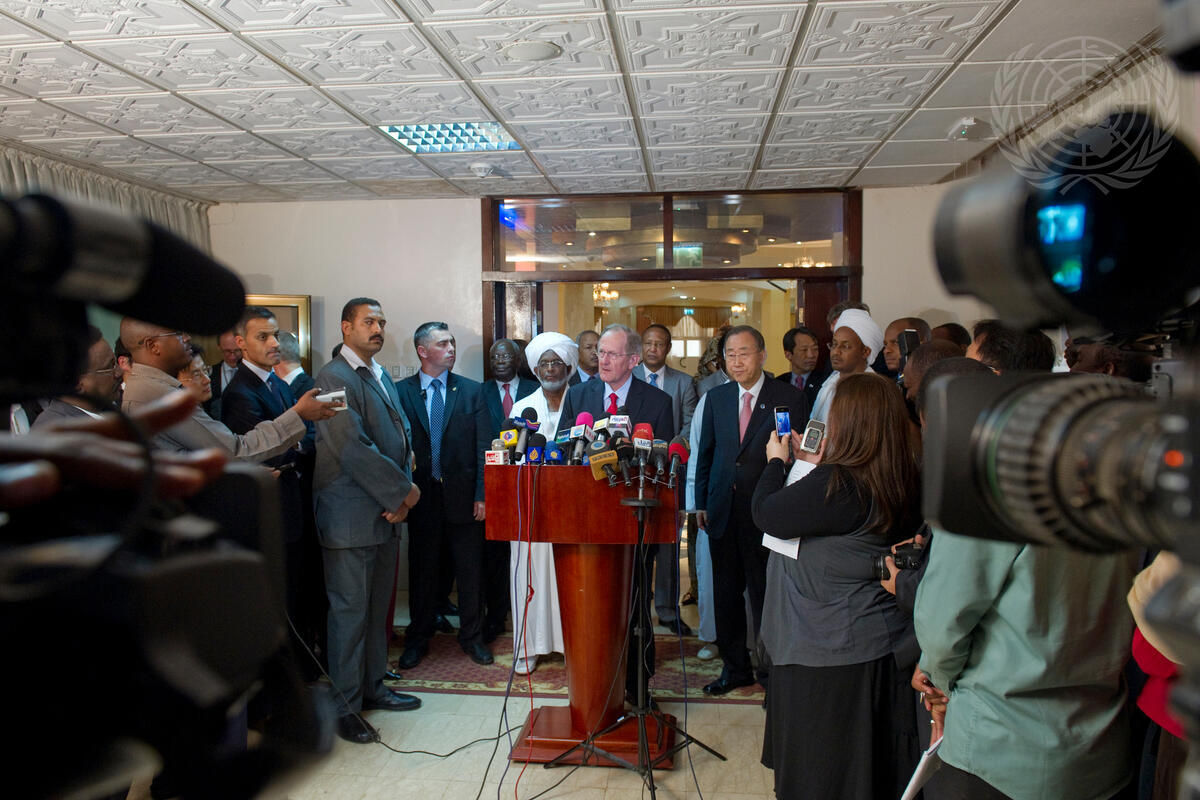 Secretary-General Ban Ki-moon (right) and Joseph Deiss, President of the sixty-fifth session of the General Assembly, speak to journalists upon their arrival in Khartoum. Thereafter they have a working lunch with Ali Ahmed Karti, Minister for Foreign Affairs of Sudan (seen on left).
