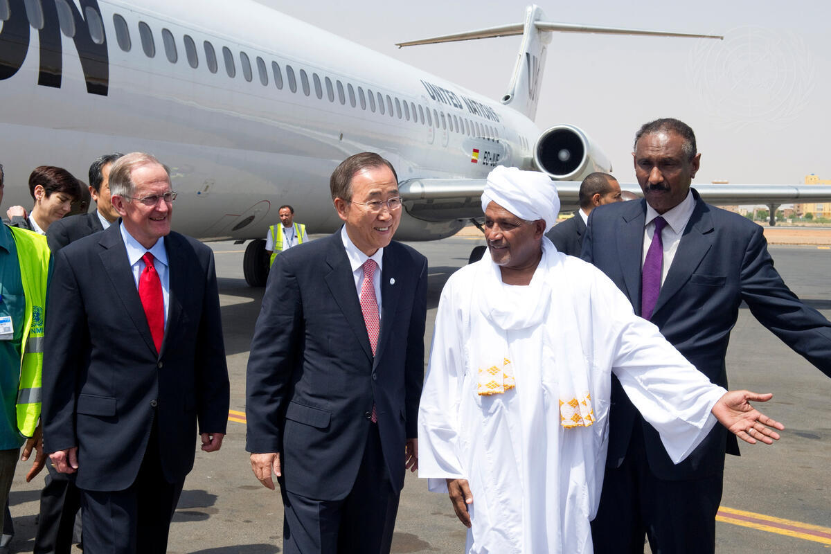 Secretary-General Ban Ki-moon (second from left) and Joseph Deiss (left), President of the sixty-fifth session of the General Assembly, are met by Daffa-Alla Elhag Ali Osman (right of Mr. Ban), Permanent Representative of the Republic of the Sudan to the UN, as they arrive in Sudan’s capital, Khartoum.