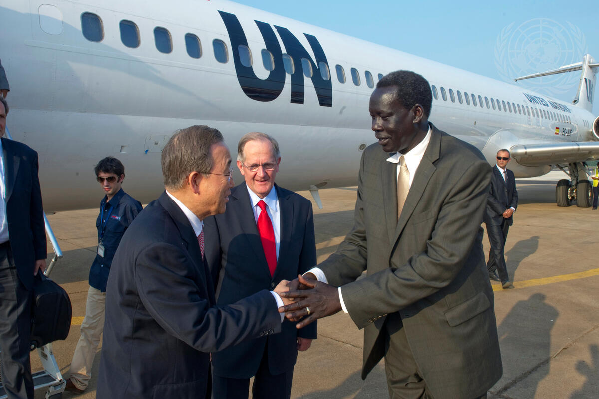 Secretary-General Ban Ki-moon (left) and Joseph Deiss (centre), President of the sixty-fifth session of the General Assembly, are met by Deng Alor Kuol, Minister for Regional Cooperation of the Government of Southern Sudan, as they arrive in Juba, capital of South Sudan.