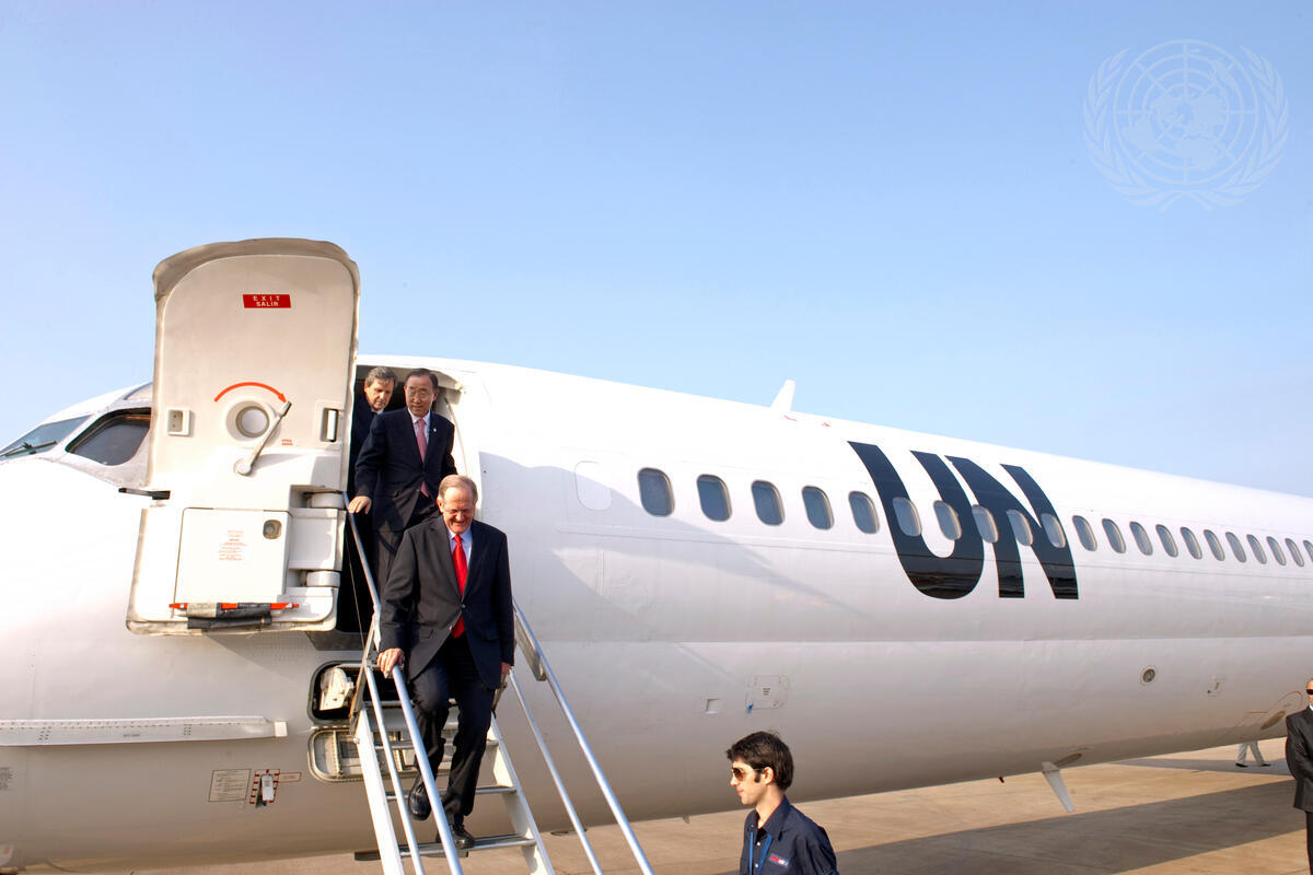 Secretary-General Ban Ki-moon (second); Joseph Deiss (first), President of the sixty-fifth session of the General Assembly; and Alain Le Roy (third), Under-Secretary-General for Peacekeeping Operations; disembark the aircraft in Juba. They proceed to attend the Independence Ceremony of the Republic of South Sudan.