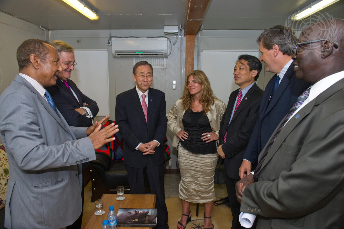 Upon his arrival to Juba, Secretary-General Ban Ki-moon (centre) is briefed by his senior staff, including Haile Menkerios (first left), outgoing Special Representative for Sudan; and Hilde Johnson (fourth from left), new Special Representative and Head of the United Nations Mission in the Republic of South Sudan (UNMISS).