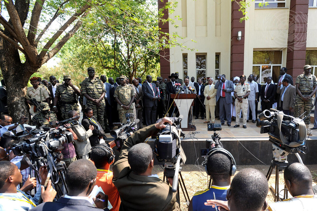 Omer Hassan A. Al-Bashir (at podium), President of the Republic of the Sudan, holds a press conference during his visit to Juba, South Sudan's capital, in the week before the South holds its long-awaited referendum on self-determination.